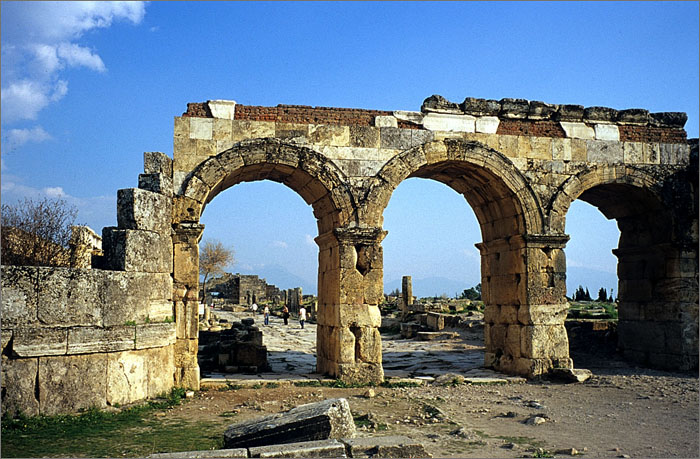 - 설명터키 파묵칼레에 있는 '성스러운 도시' 라는 뜻의 히에라폴리스 유적은 기원 전 190년에 알렉산더 대왕의 부하 중 한사람이 세운 페르가몬왕조의 시조 텔레포스의 아내 히에라의 이름을 따서 지은 도시라 하는 설과 르리기아 人등 이전에 이곳에 살았던 주민들은 이곳의 온천지역을 신앙의 대상으로 삼아 히에론 신전을 지어 이것이 히에라폴리스라는 도시로 이어졌는지도 모른다고한다.