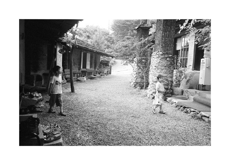 양 편으로 갈라 대조가 되는 모양이네요. 한옥 대 양옥, 남자아이 대 여자아이, 시선의 엇갈림..