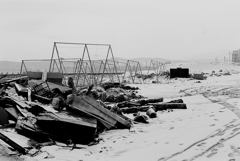 폐자재들과 하얀 눈의 대비. 더러움과 깨끗함의 대비. 굳.