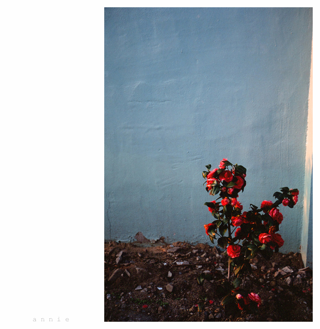 냉냉한 벽면과 붉은 동백과의 대비가 절묘합니다.