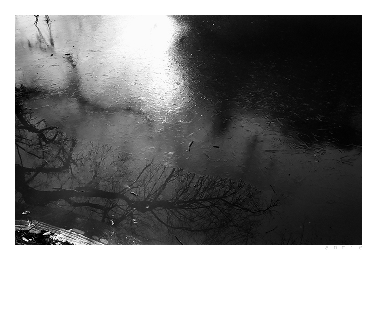 살얼음에 비스듬히 걸친 나무 그림자