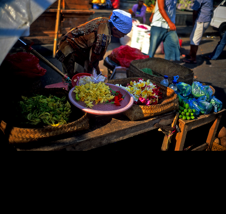 인도네시아입니다.. 파는 물건은 제사용품.. 흰두 신에게 바치는 꽃과 과일의 제물들 입니다.