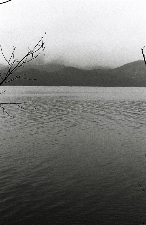 구름에 가린 산의 모습과 진한 느낌의 강이 좋습니다