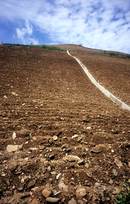 - 설명강원도의 밭들은 매우 가파른 경사지에 조성되어 있는 경우가 많아서 경운기를 사용한 밭갈이가 불가능하다. 포크레인이 밭을 간다.
