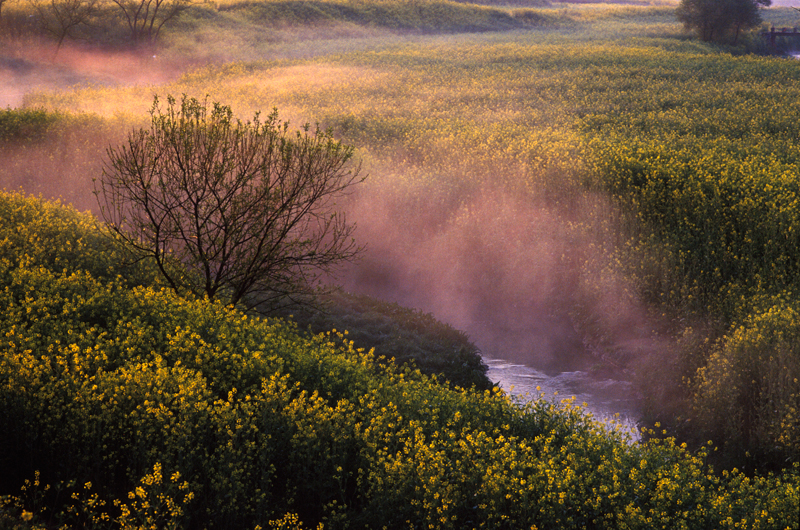 이른 새벽 안개와 어우러진 유채가 멋스럽습니다.