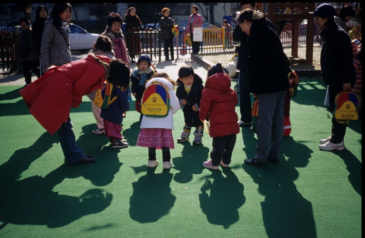 인삿말을 아랑곳하지 않는 유치원 아이들의 멋모르는 표정을 보니
