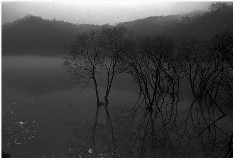 물안개, 물속의 나무, 물에 비친 산그림자.