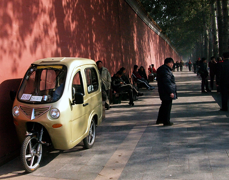 붉은 담장, 삼륜차, 뒤돌아보는 남자 표정, 줄줄이 늘어선 사람들과 가로수... 여행중의 인상적인 한 장면입니다.