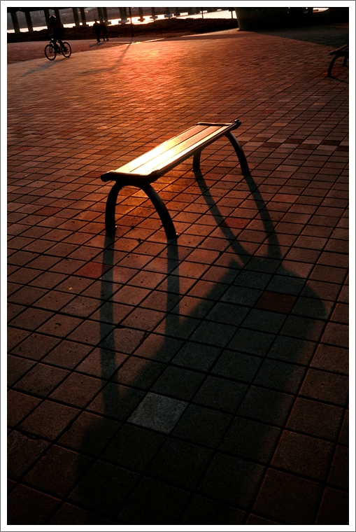 황혼빛이 강렬하게 벤치를 비추고 있네요