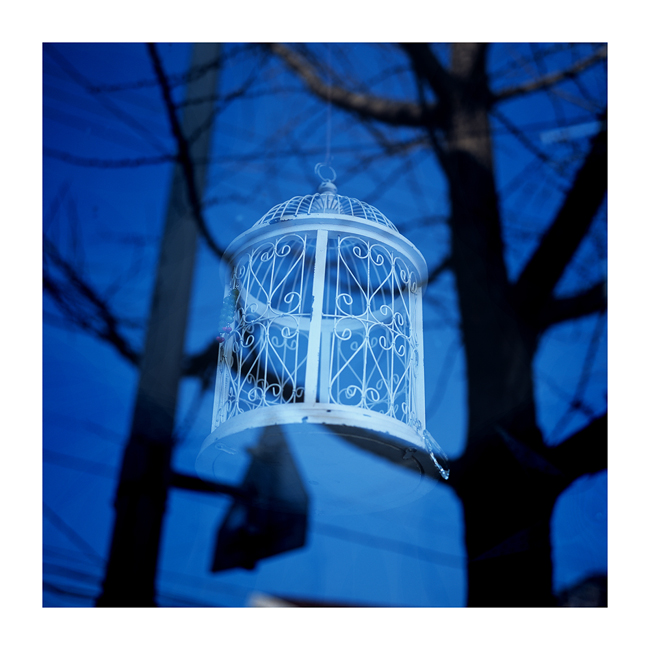 푸른 나무 그늘에 갖히거나 걸려 있는 새장인지,