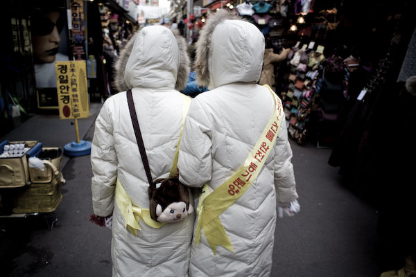 - 설명시장에서 심플한 겨울 외투의 뒷 모습