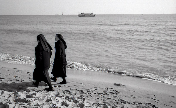 수녀님이 산책하는 해변 풍경이 한가롭습니다.