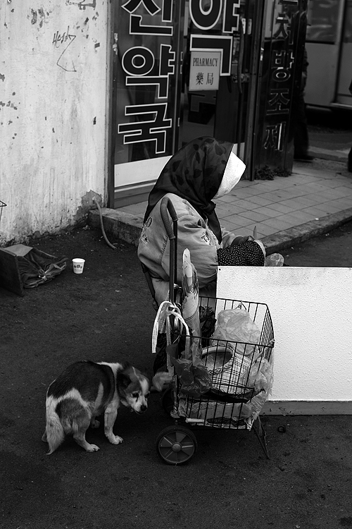 군밤을 파는 할머니가 해장국집에서 나온 뼈다귀에 붙어있는 고기를 발라 저 개를 먹이더군요.