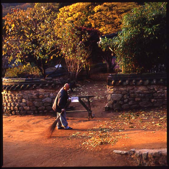 스님이 황금을 쓸어 모으시는 것 같습니다.