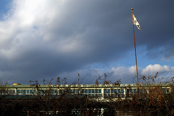덩쿨과 태극기, 파란 하늘이 폐교와 잘 어울립니다.