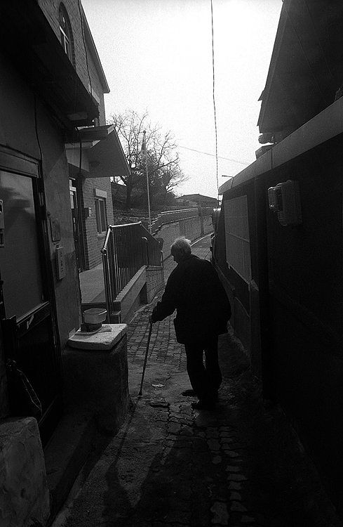 할아버님의 흰머리카락, 지팡이, 마르신 체구와 저 뒷편의 잎이 다 떨어진 나무와 매치가 됩니다.