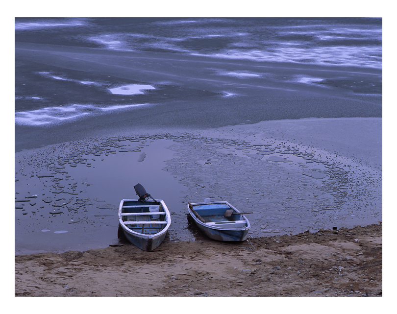 얼음을 막 깨고 나온 것 같은 두척의 배와 꽁꽁얼어붙은 뒤의 호수의 대비가 흥미롭습니다.