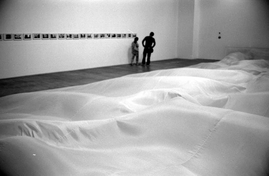 넓은 공간에, 화면의 오른쪽 뒷벽 아래에 대형 선풍기가 5-6대가 있어서 저 커다란 하얀 천 밑으로 계속 바람을 일으켜서 파도물결 모양을 만들어 줍니다.