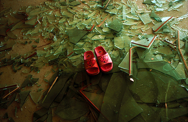 박살난 유리파편 위에 너무나 고이 올려진 아이의 신발이라니...