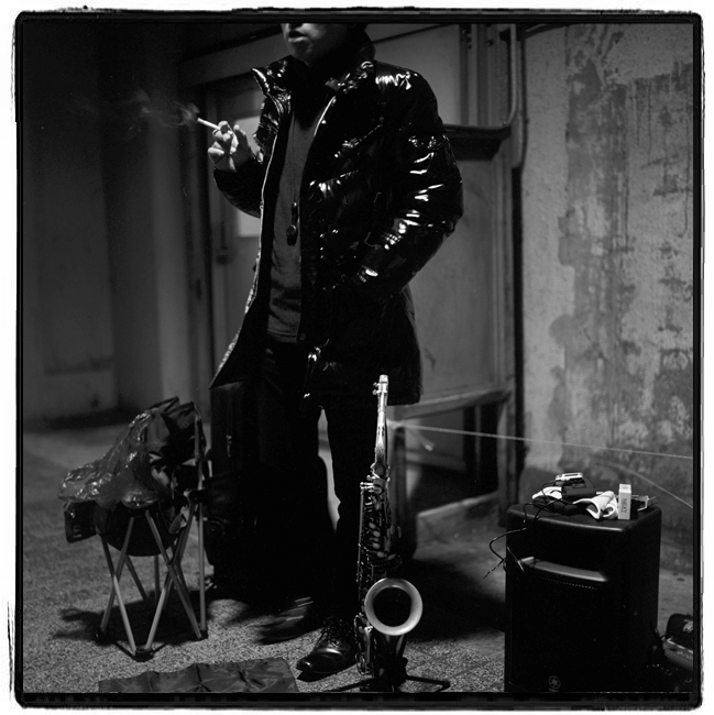 반짝 반짝한 코트가 유난히 눈에 띕니다. 밖에서 추운데 연주하고 잠시 담배를 피우시는 중인가봐요..