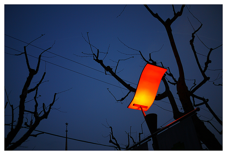 새벽의 푸른 기운이 붉은 조명과 대비되면서