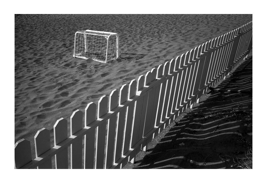 사선으로 나뉜 흑과 백.. 음지에 있는 담장의 일그러진 그림자...하얀 세상에 있는 골대..