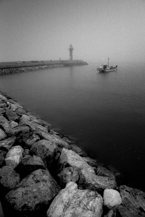 아득한 해무 사이로 보이는 방파제의 라인과 배 한척이 한폭의 그림 같습니다.