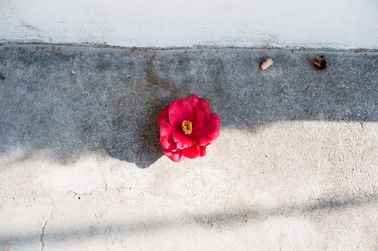 그림자에 경계에 떨어진 꽃이 이제 막 봄이 지나감을 아쉬워하고 있는 것 같이 느껴졌습니다.