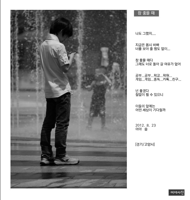 허영주님의 댓글 허영주 12-08-23 10:29 인용: 원 작성회원 : 염상협 분수안의 아이와 사뭇 대조적인 정서입니다. 좋은 사진 잘 감상했습니다. 고맙습니다~~~~^^ <!-- BEGIN TEMPLATE: bbcode_quote_new --> <div style="margin:5px 15px 10px; "> <div style="font-size:0.9em;margin-bottom:2px;">인용:</div> <table cellpadding="" cellspacing="0" border="0" width="100%"> <tr> <td class="alt2" style="border:1px inset #ddd;text-align:left;padding:10px 20px;"> <div style="font-size:0.9em;margin-bottom:5px;"> 원 작성회원 : <strong>염상협</strong> </div> <div style="font-style:italic">분수안의 아이와 사뭇 대조적인 정서입니다.<br /> 좋은 사진 잘 감상했습니다.</div> </td> </tr> </table> </div> <!-- END TEMPLATE: bbcode_quote_new --><br /> <br /> <br /> 고맙습니다~~~~^^<img src="/img/smilies/smile.gif" border="0" alt="" title="Smilie" class="inlineimg" /> 추천 회원목록 김민정(히카루) 염상협 김승현 김형옥 annie/정은주 서원호 신한주 김 종원 오 명호 박찬민 정태환 이혜근 엄창호 임광태 이상훈 허영주 정승진 추천하기 닫기 쪽지보내기 전송 닫기