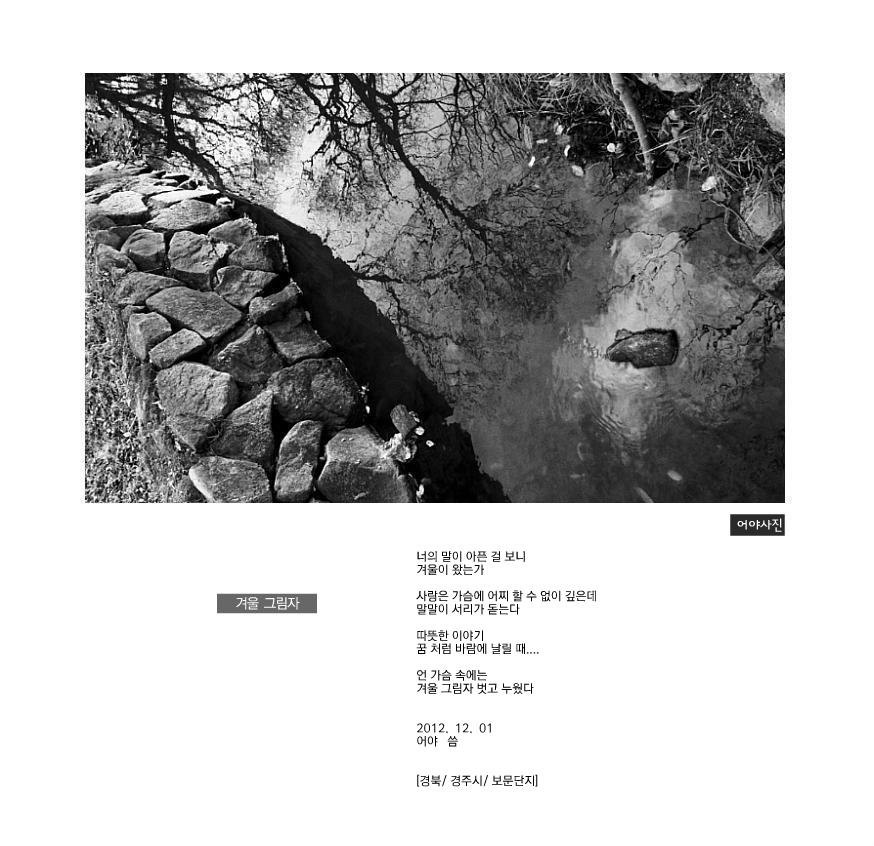 뼈속까지 차디 찬 겨울 계곡물에 담겨 시리다 못해 아프겠어요 겨울 그림자는 그렇게 아픈 건가봐요~~ 추울수록 따뜻한 이야기 나눠야겠네요~~^^ |