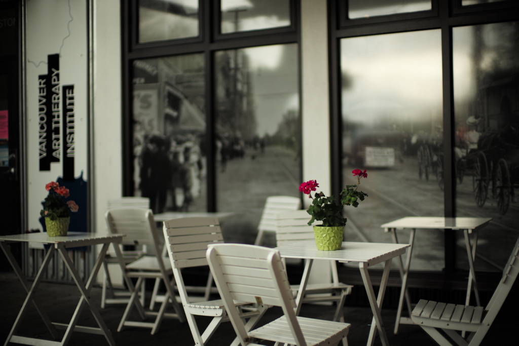 유리창 안에 옛풍경을 찍어 붇혀둔 사진과 싸구려 나무 테이블과 화분!!