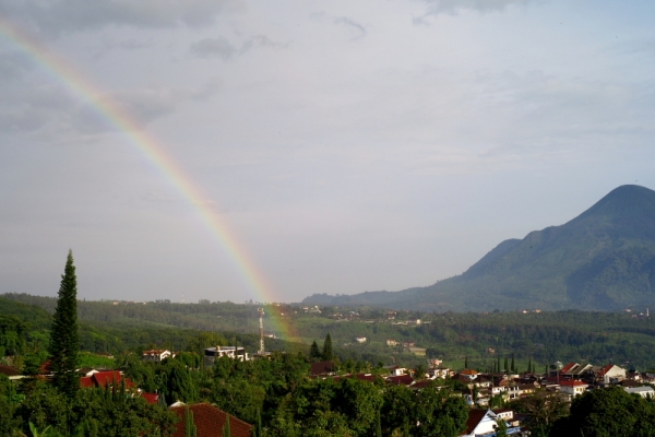 새해아침에 호텔방에서 내려다 보이는 먼산에 무지개가 올라왓습니다.