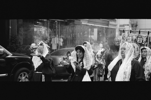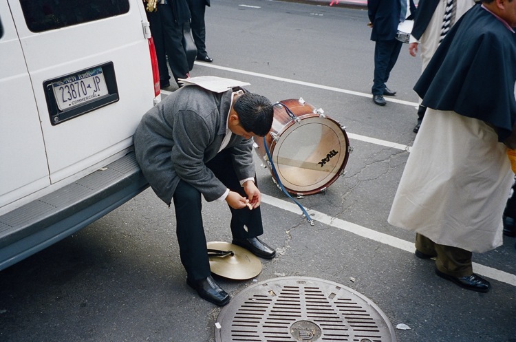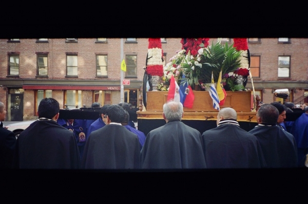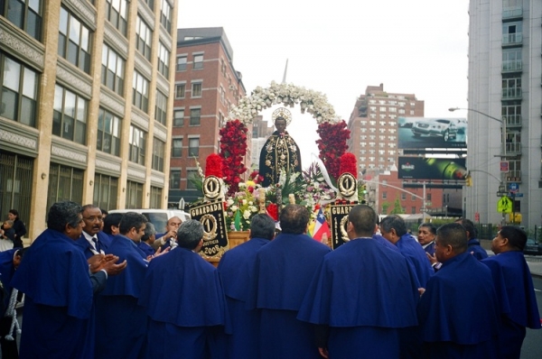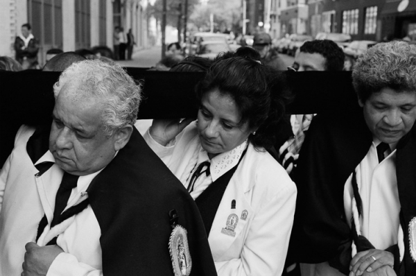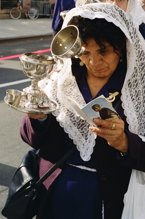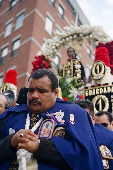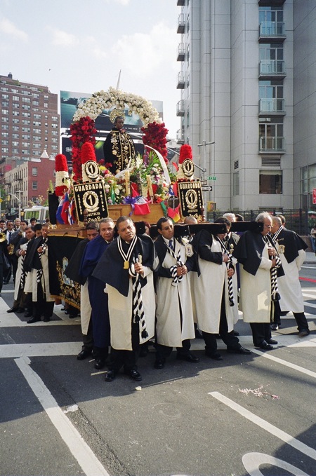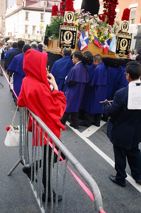 파란옷을 입은분과 하얀옷을 입은 분들이 교대로 가마(?)같은걸 운반하구. 뒤에는 라틴 악단이 뒤를 따랐구요. 선두에서 선 아주머니들이 향을 피우구요. 아마 과일을 태우는거 같은 향이었습니다.