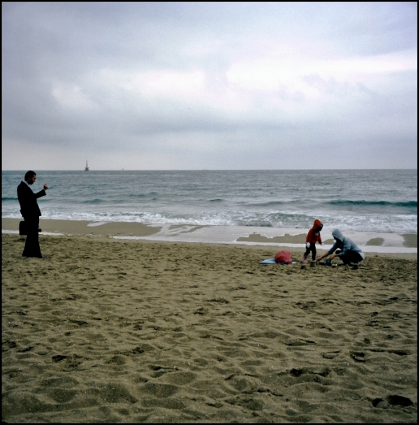마침 백사장을 보니 비가 오는 데에도 엄마와 어린 딸 처럼 보이는 모녀가 모래장난을 하며 놀고 있더군요. "저 모녀의 모습이나 먼 발치에서라도 찍어 보자"라고 생각을 하며 롤라이를 집어들고 백사장을 가로 질러 가는데 갑자기 두 모녀가 일어서며 반갑게 손을 흔들더군요. 물론 저를 향해서가 아니라 돌아보니 해수욕장에 접한 큰 길 쪽에서 가방을 든 양복 입은 사람이 다가오고 있었습니다. "아- 엄마와 딸은 백사장에서 놀다 퇴근하는 아버지를 만나기로 한거구나"