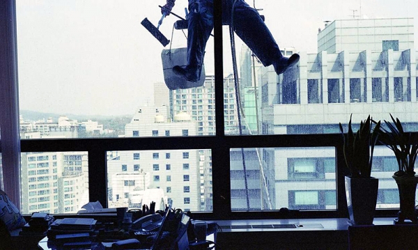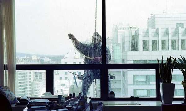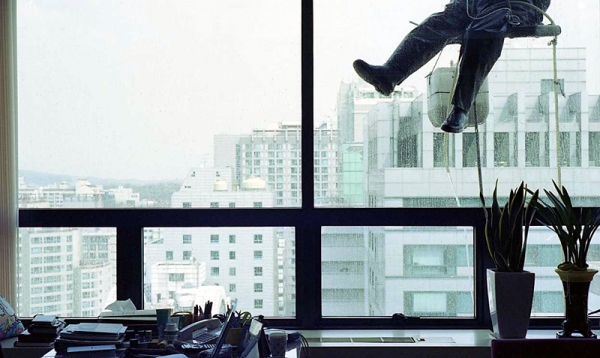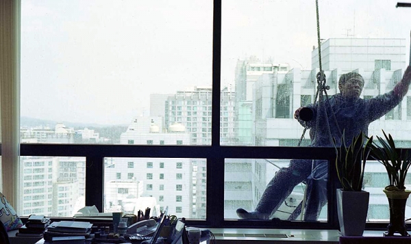밧줄과 함께 작업자의 발이 내려와 깜짝 놀라게 한다.