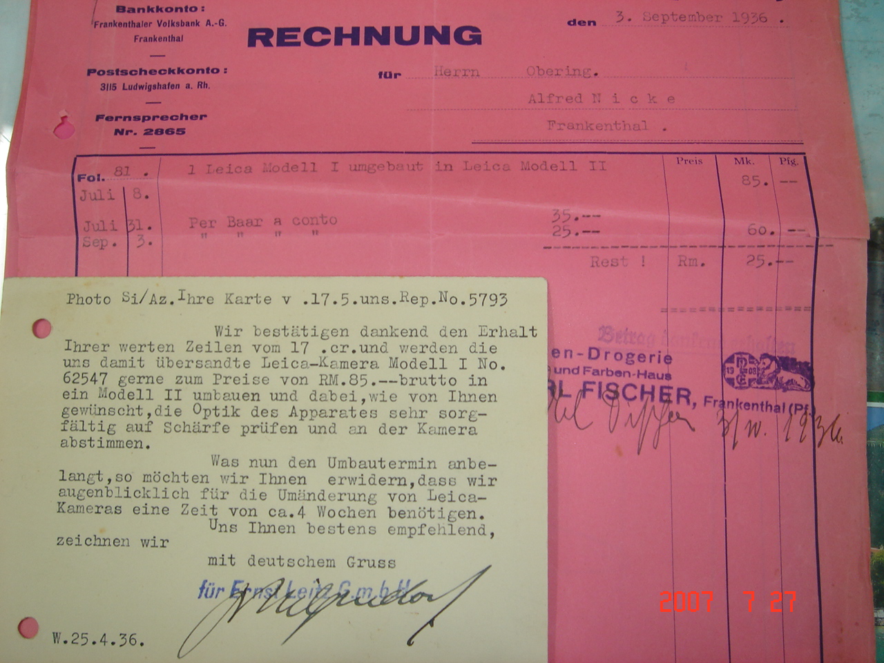 Leica II 로 업그레이드하고 85 라이히마르크(RM)를 지불한 영수증 같습니다.