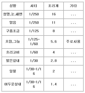물론 여름 철의 한 낮은 Sunny 16이라하여 (필림 스피드는 100기준) 샷타 스피드는 125, 조리계는 16 이라는 일반적인 기준이 있는데, 조금더 세밀한, 여러 상항에 따른 노출 기준이 있을 것도 같은데...