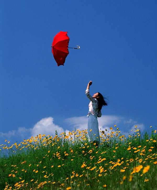 우산의 강렬한 색감이 인상적입니다.