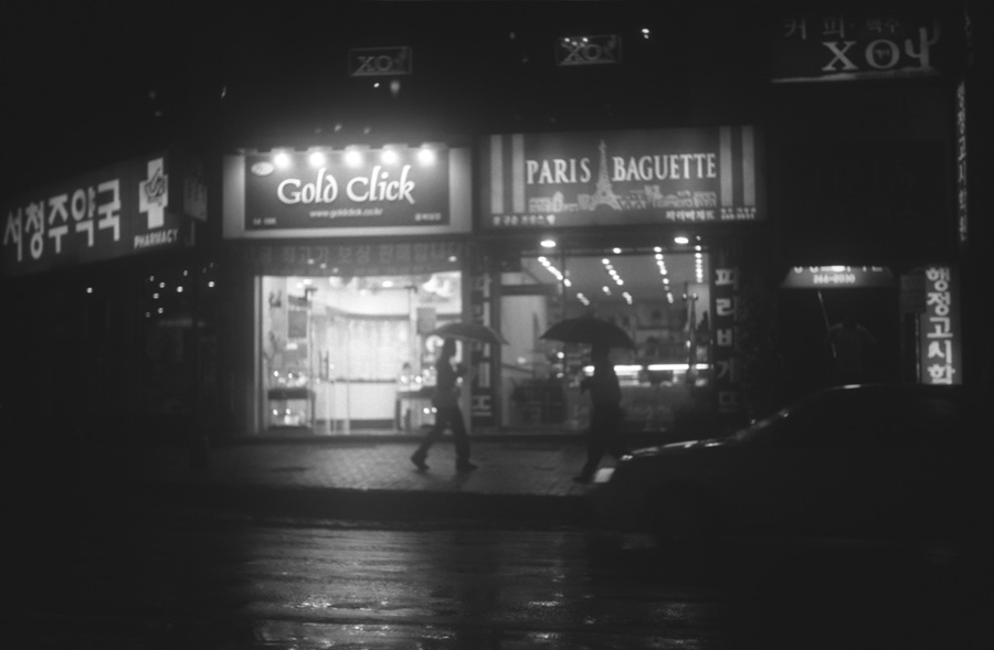 어둠속에 우산을 들고 서로 마주치는 두사람이지만,