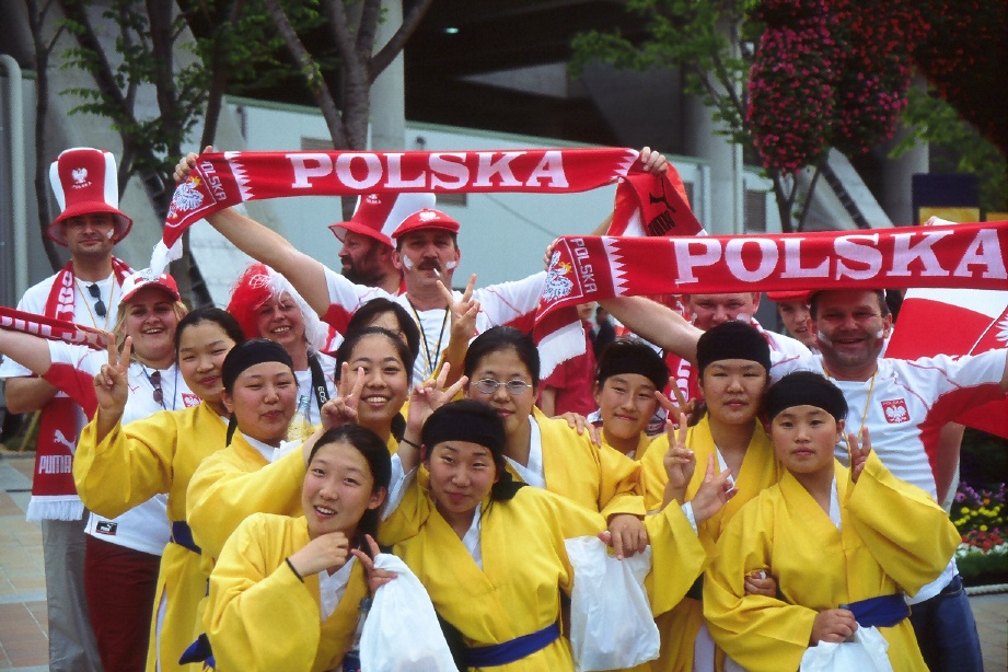 부산경기장에서 한국 낭자들과 폴란드 응원단이 다정하게 포즈를 취했다.