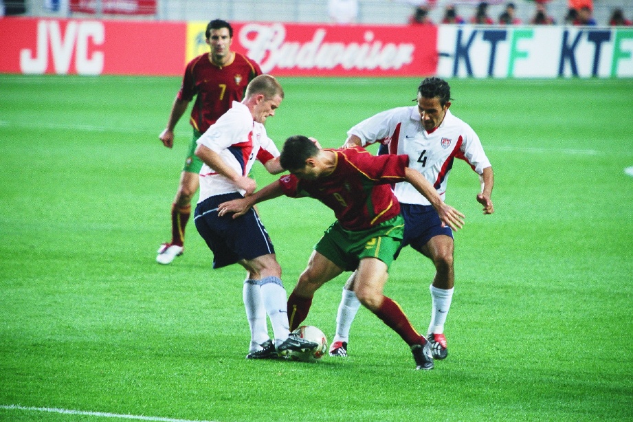 미국팀 버홀터(3)와 마스트로에니(4)가 포르투갈팀 파울레타(9)를 에워싸고 볼을 빼앗으려 하고,
