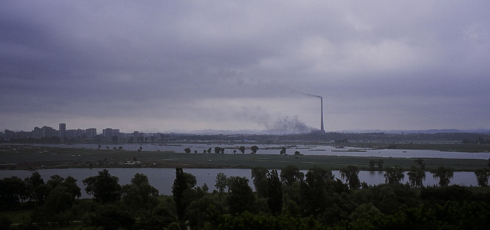 검은 연기를 뿜고있는 높은 굴뚝이 있는 곳은 평양화력발전소이다.