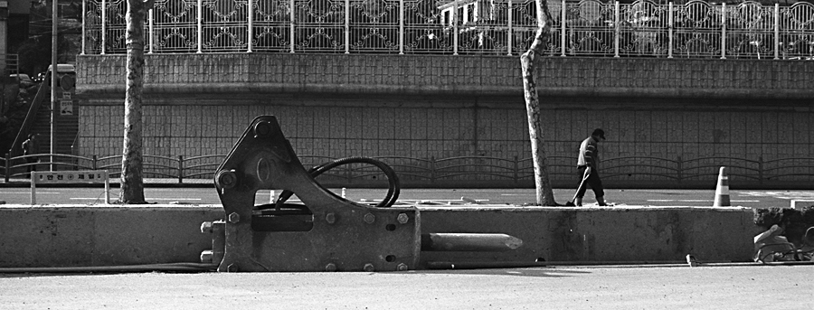커다란 중기와 그 곳에서 일하시는 분의 고개숙인 모습...