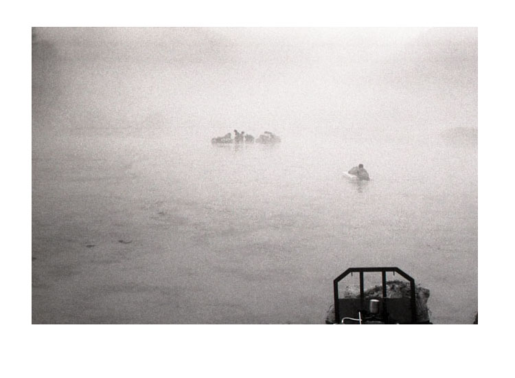 안개낀날 스티로폴 타고 미나리 작업장으로 가는 모습