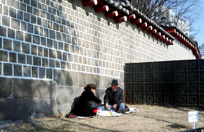 고궁의 담을 배경으로 겨울 양지 바른 곳에 멋지게 차린 분들의 나들이가 레드엘마를 통해서 따스하게 보입니다.