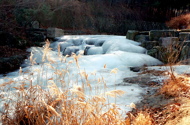 위압적 얼음에 ,아주 부드럽고 노랗게 빛나는 억새가 따스하게 가슴으로 다가옵니다.