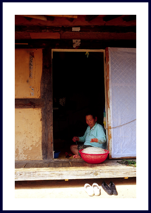 할아버지는 밖에서 거친 삼베 껍질을 다듬는 일을 하시고, 할머니는 안에서 고은 베실을 만들어 내신다.