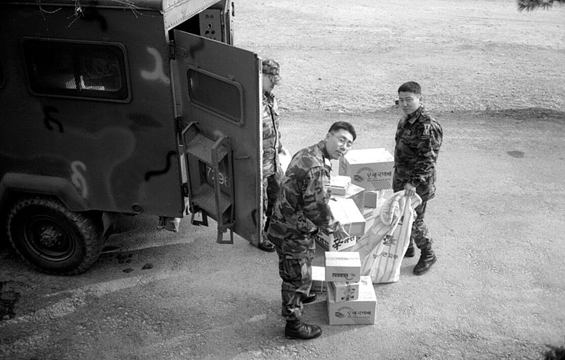 - 설명 XX사단 우편배달차가 들어오고 친구, 부모님, 애인들이 보내준 선물 상자들을 내려놓고 있는 우리 계원들. 몇 안되는 인사과 계원들이 한번에 들기엔 많은 양일지라도 가득가득 오는 소포들은 기쁘기만 하다.