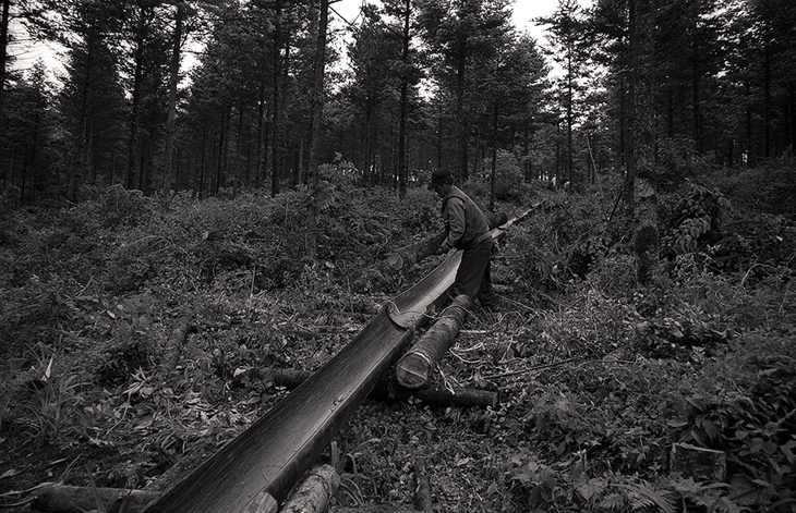 홈통을 이용해서 자른 전나무를 아래로 운반한다는 설명을 들었다...