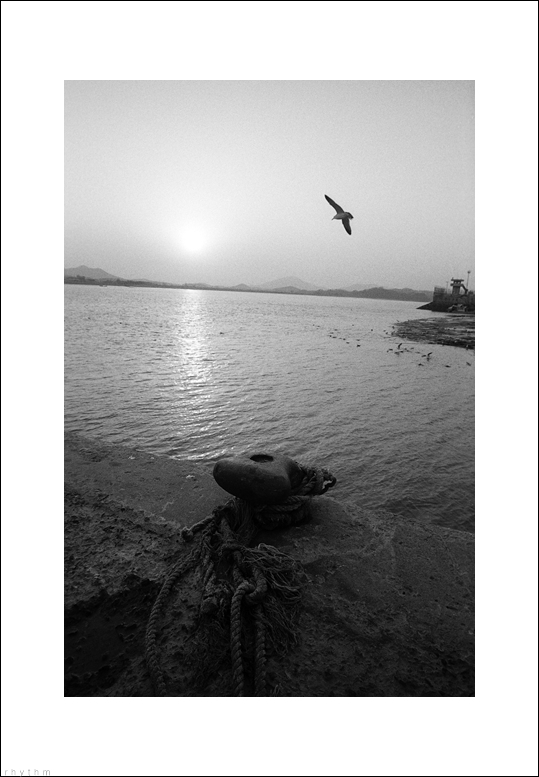부둣가에서 묶여진 밧줄 건너편으로 날아다니는 새의 모습이 자유롭게 느껴집니다.
